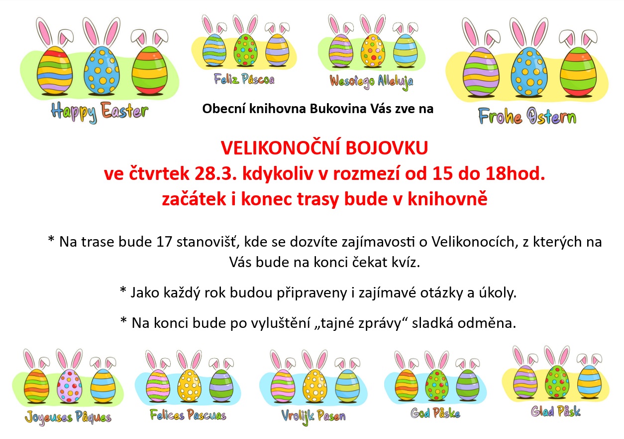 Obecní knihovna Vás zve ve čtvrtek dne 28. března 2024 na 3. Velikonoční bojovku. Začátek i konec trasy bude v knihovně, zúčastnit se můžete kdykoliv v čase od 15ti do 18ti hodin. Podrobnější informace v přiloženém letáku.