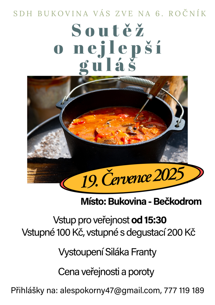 Sbor dobrovolných hasičů Bukovina si Vás dovolují pozvat na 6. ročník Soutěže o nejlepší guláš.