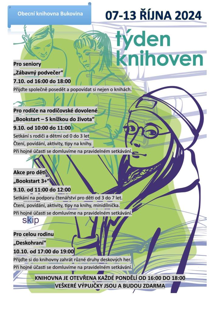 Obecní knihovna v Bukovině se již tradičně zapojuje do celostátní kampaně Týden knihoven. V pondělí 7.10. od 16 hodin proběhne setkání seniorů, středa 9.10. od 10 hodin bude věnována rodičům s malými dětmi a ve čtvrtek 10.10. od 17 hodin hraní různých deskových her. Bližší informace v přiloženém letáku.