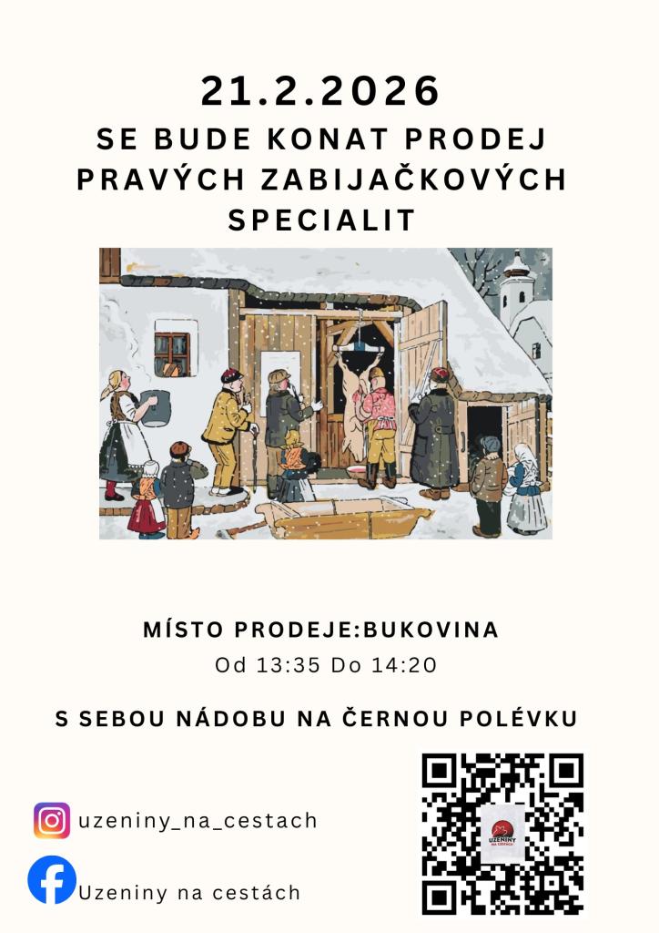 V sobotu 21. února k nám zavítá pojízdná prodejna se zabijačkovými specialitami. Prodej proběhne od 13.35 do 14.20 hodin na bývalé točně. Nádobu na vynikající černou polévku nezapomeňte s sebou, bude jí dostatek.