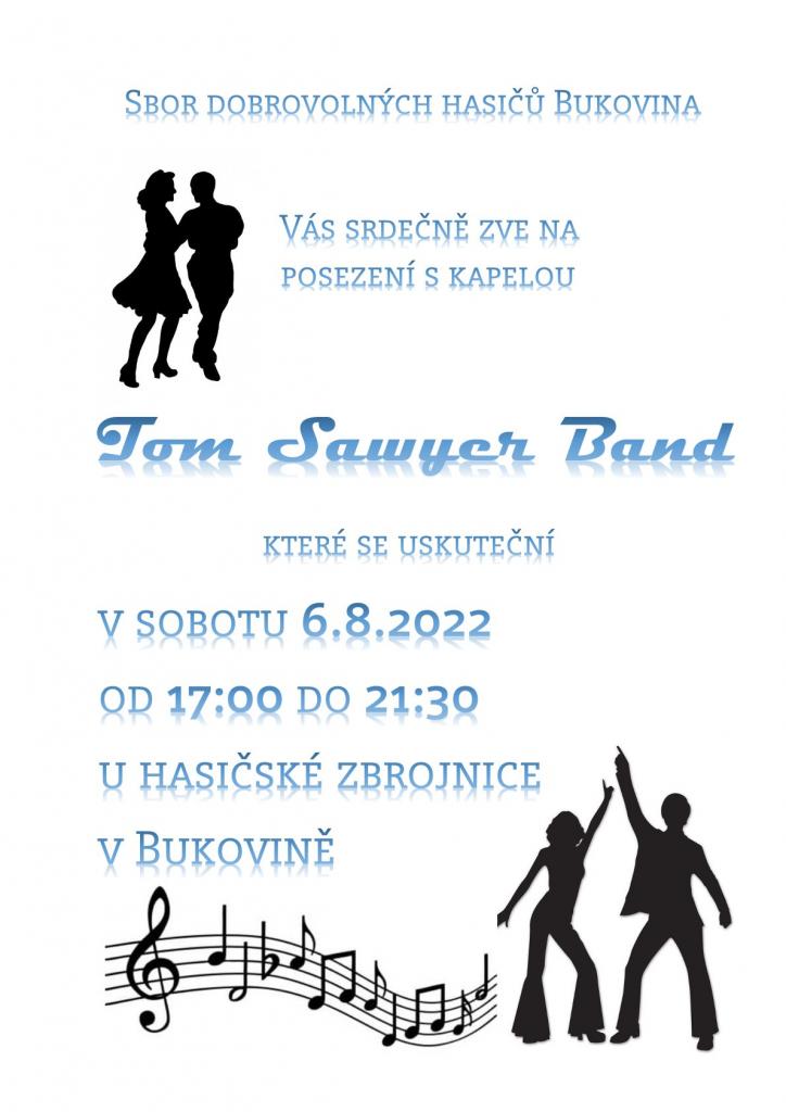 Sbor dobrovolných hasičů Bukovina Vás srdečně zve na posezení s kapelou Tom Sawyer Band, které se bude konat v sobotu 6. srpna od 17.00 hodin u hasičské zbrojnice.