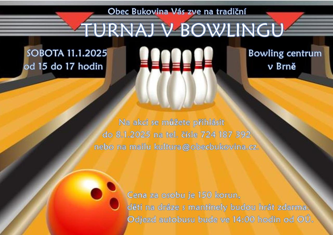 Oznamujeme, že se v sobotu 11. ledna od 15 hodin uskuteční v hale Bowling Brno tradiční novoroční turnaj v bowlingu. Na akci se můžete přihlásit do 8. ledna na tel. čísle 724 187 392 nebo na emailu kultura@obecbukovina.cz Odjezd autobusu bude ve 14 hodin od OÚ, cena za osobu je 150 Kč, děti na dráze s mantinely budou hrát zdarma.