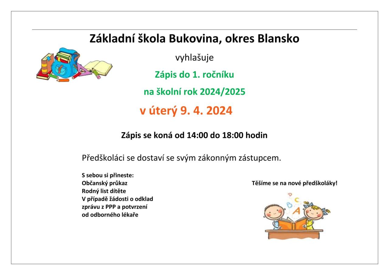 Základní škola Bukovina vyhlašuje zápis na školní rok 2024/2025 v úterý dne 9. dubna od 14.00 do 18.00 hodin.
